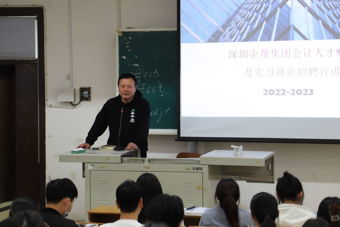 为拓宽广大毕业生的就业渠道,最靠谱的十大足球平台于2022年11月21日下午在综阶三举行专场招聘宣讲会,此次宣讲会邀请到深圳企帮集团来公司招聘会计类专业人才。公司对此次招聘会高度重视和支持,党总支书记张家顺、办公室主任杨燕亲临会场。此次宣讲招聘会共有150多位同学参加。