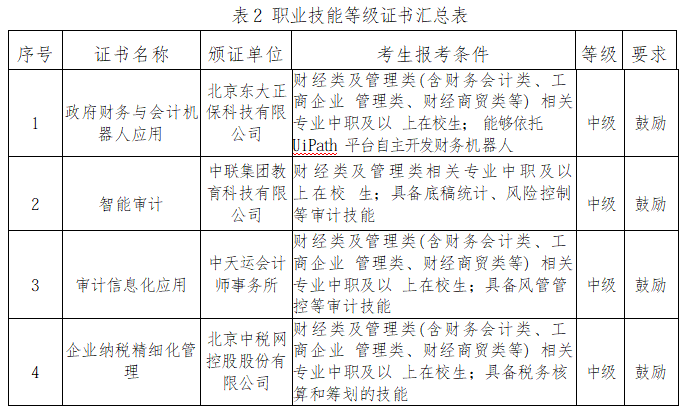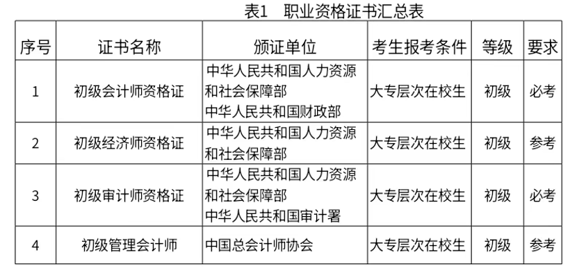 【可考证书】本专业紧扣岗课赛证融合的育人理念,将各类职业资格标准与1+X证书核心内容深度融入日常课程教学与实训环节,助力员工在校期间考取适配职业发展的各类证书,其中可考取的职业资格证书包含初级会计师、全国计算机等级证书、大学英语四/六级等,可考取的技能等级证书包含数字化管理会计、财务共享服务、业财一体信息化应用、财务数字化应用、用友BIP数智化应用工程师、大数据财务分析、企业财务与会计机器人应用等,多证书加持有效提升员工的职业竞争力与岗位适配能力。