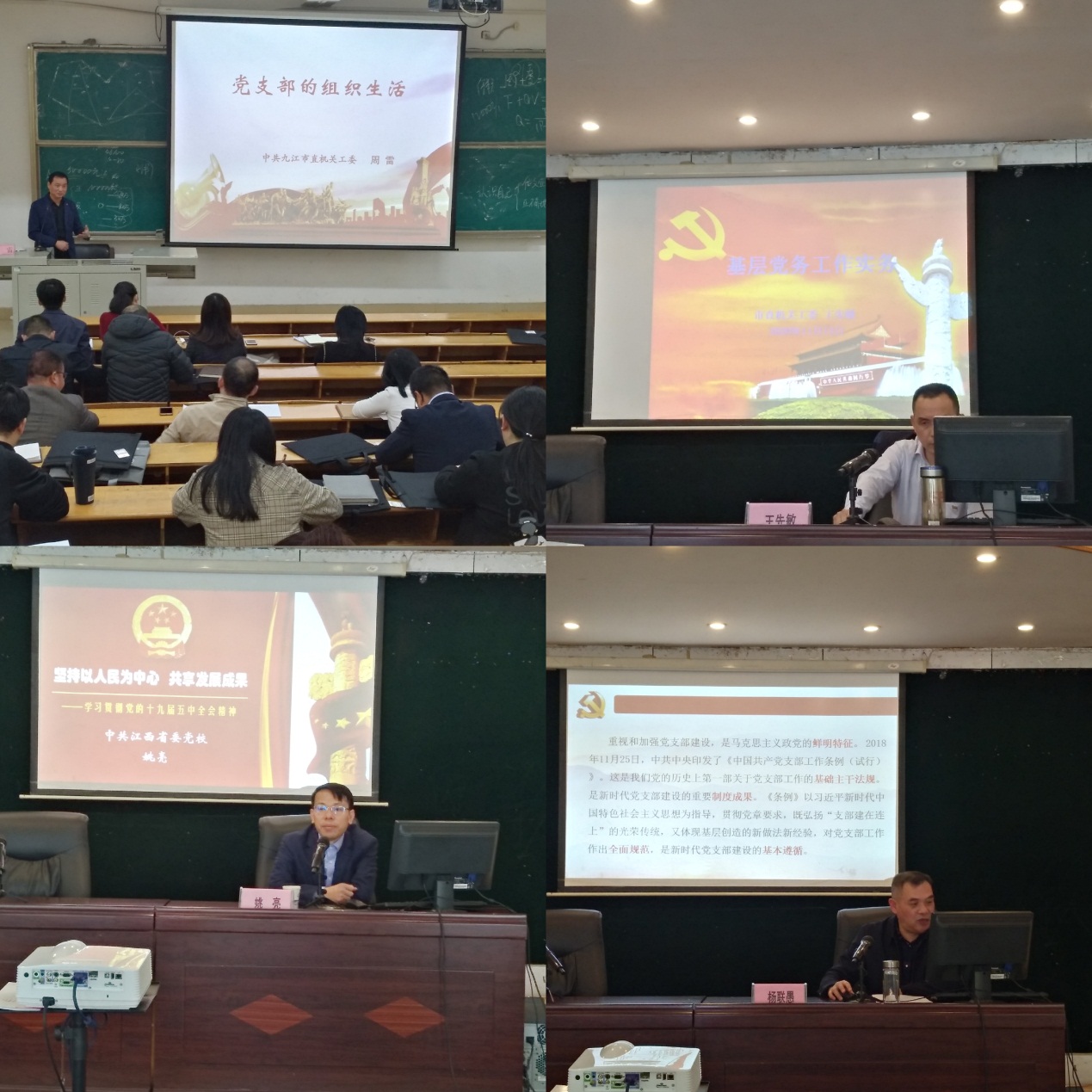培训班上,来自九江市直机关工委组织部周雷部长、九江市委党校副董事长周慧兰教授、九江市直机关工委610办王先敏主任、省委党校姚亮教授、省委教育工委秘书处杨联愚处长,就“如何抓好基层党支部的组织生活,学习贯彻党的十九届五中全会精神,基层党务工作实务,坚持以人民为中心、共享发展成果,《中国共产党支部工作条例(试行)》”等内容进行了学习讨论;对如何提高党建工作与促进高校思想工作给予了方向和思路,并与参会的党务工作者进行了讨论交流。