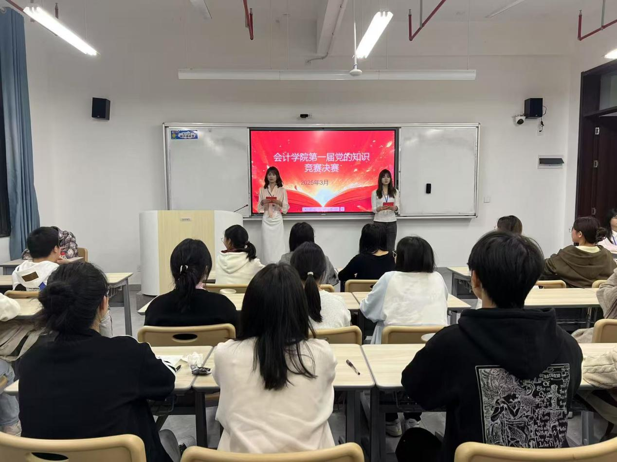 竞赛分为初赛、决赛两个阶段。初赛于3月17日进行,经过激烈角逐,共有六支队伍脱颖而出,顺利进入决赛。决赛于3月25日晚上7点整在八里湖校区一号教学楼209教室,正式开始。现场气氛紧张而又热烈,各参赛队伍准备充分、沉着冷静,经过一轮又一轮的比拼,最终23会计信息管理3班团队凭借出色表现,一举夺得会计公司党的基本知识竞赛冠军。