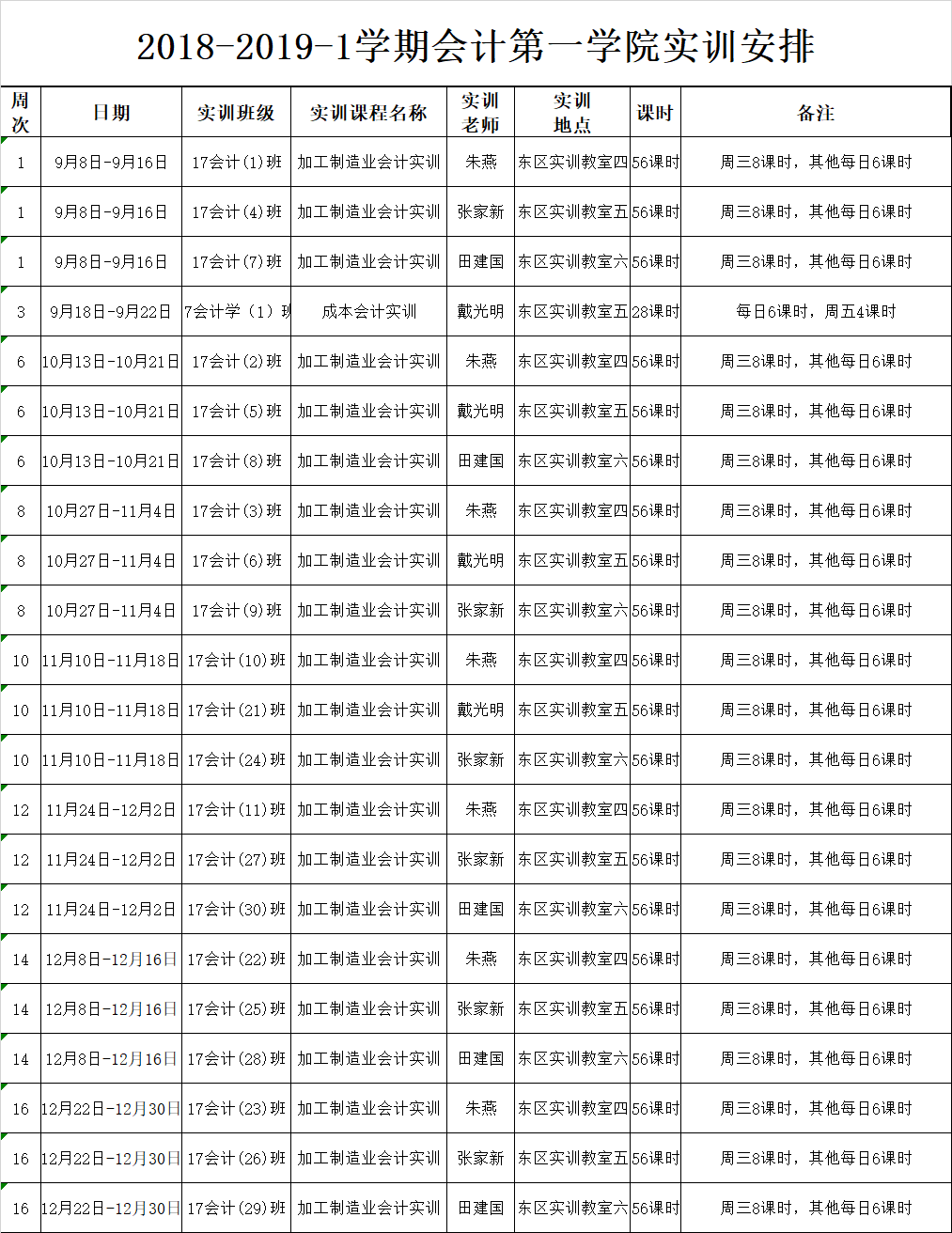2018-2019-1学期停课实训安排表