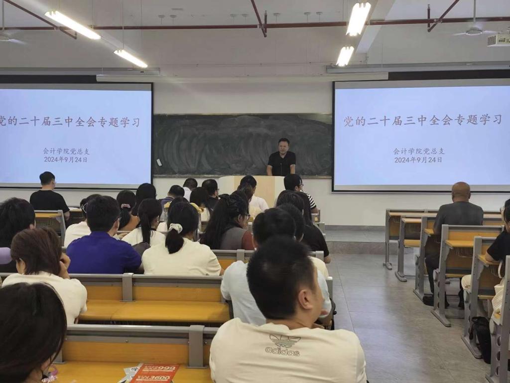 会议指出,党的二十届三中全会是在以中国式现代化全面推进强国建设、民族复兴伟业的关键时期举行的一次十分重要的会议。全会审议通过的《中共中央关于进一步全面深化改革、推进中国式现代化的决定》,是习近平新时代中国特色社会主义思想的改革新篇,对全面深化改革作出总动员总部署。作为高校教育工作者,要坚持以习近平新时代中国特色社会主义思想为指导,深入学习贯彻党的二十届三中全会精神,深化党纪学习教育,扛牢政治责任,强化政治担当,以立德树人为根本任务,教育引导青年员工听党话,跟党走,为培养担当民族复兴大任的时代新人贡献财院力量。