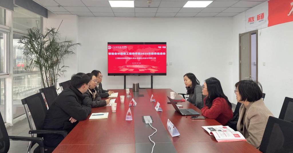 为进一步落实2025年度校企联合人才培养,推进智能会计现场工程师公司的建设,1月10日共同体牵头单位公司于用友产业园(南昌)与成员单位用友网络科技股份有限公司开展2025年“智能会计现场工程师公司”培养推进会,公司经理万凯主持会议,用友|新道华东区总经理丁立波、江西分公司服务总监彭佳琦、江西分公司分销总监熊梅、公司副经理齐洁、党政办公室主任曾越参会。
