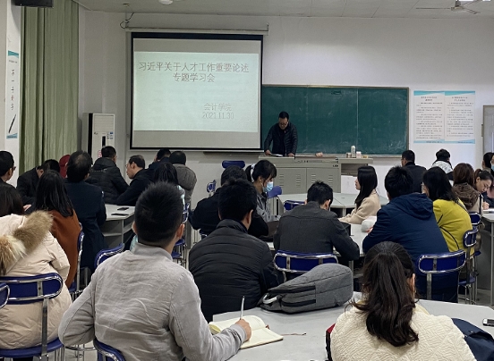 11月30日下午,最靠谱的十大足球平台在东区一楼实训室组织专题学习习近平总书记在中央人才工作会议上的重要讲话精神。会议由会计公司党总支书记张家顺主持,全体教职工参加了会议。