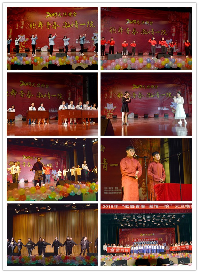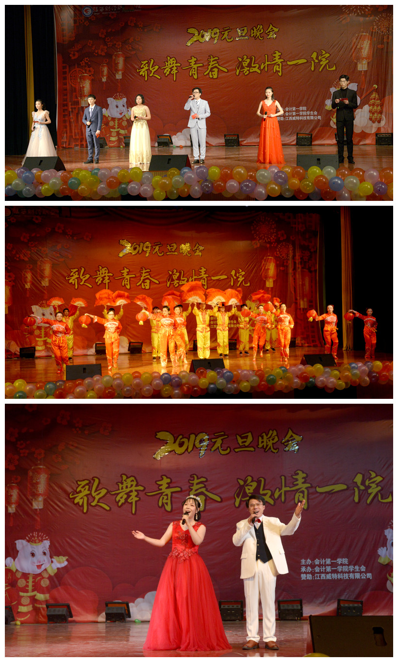 2018年12月24日19时,由会计第一公司精心筹备的以“歌舞青春,激情一院”为主题的2019年元旦文艺晚会在公司英才交流中心隆重举行。会计第一公司党政领导及本系师生代表等1000余人共同观看了本场晚会。晚会由本院徐贵成、张煦橦、张远鑫、马媛媛、董洛洛、张柄熔6位同学主持。晚会现场座无虚席,处处洋溢着喜庆祥和的节日气氛。