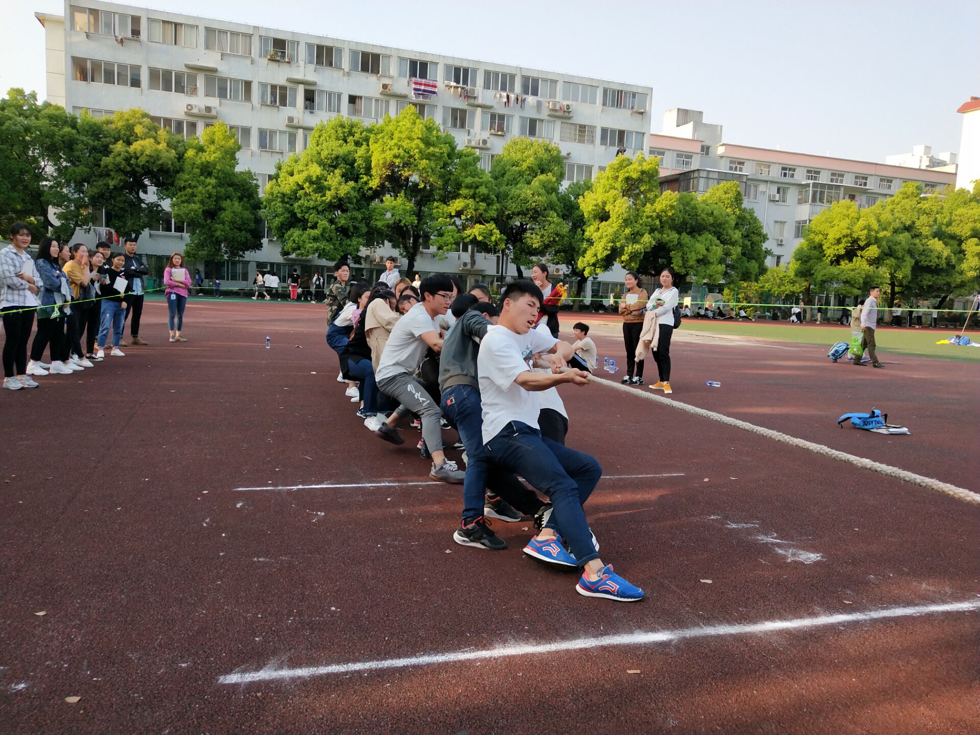当日下午,拔河比赛在田径场开幕,比赛采用抽签分组的形式决定对阵的双方,既保证了比赛的公平公正,也让比赛充满了悬念,同时,赛制采用三局两胜的方式,保证了每个同学都能发挥出自己应有的水平。比赛过程中各个班级的队员精神饱满,斗志昂扬,现场气氛异常高涨。双方队员紧紧抓牢手中的绳子,勒绳下腰,降低重心,齐心协力往后拉。众人的配合,集体的努力,在一阵阵呐喊与掌声中化作无穷的动力。