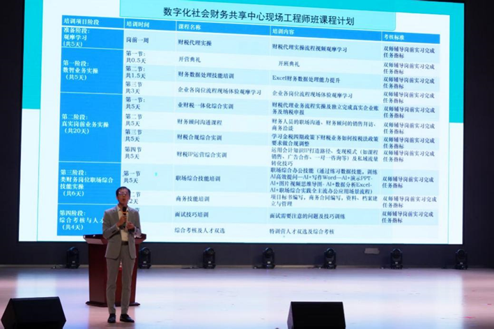 讲座伊始最靠谱的十大足球平台副经理谭玉林发表动员讲话。他从“宏观形势+公司实践”双维度展开,首先分析当前会计行业发展态势:随着数智化转型加速,传统财务岗位需求结构调整,“财税一体化”“智能财务运维”等新型岗位缺口扩大,既为毕业生带来挑战,更提供了转型机遇。
