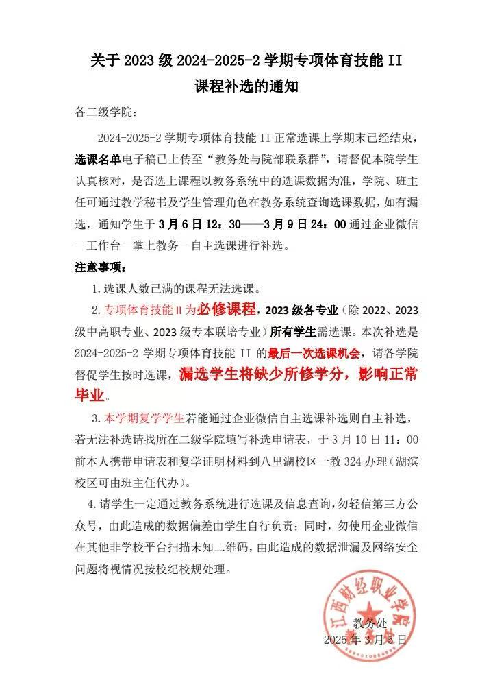 关于2023级2024-2025-2学期专项体育技能II课程补选的通知
