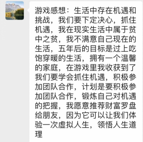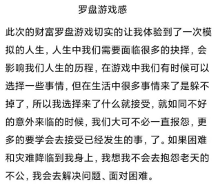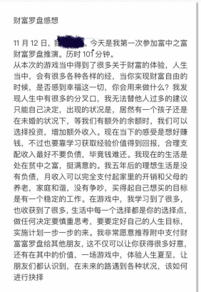 员工在复盘时提到:“很多职业虽然看上去光鲜亮丽,比如律师,但也同时伴随着高额的支出,最后每月现金流也没有多少。很多职业虽然一开始起点不高,比如服务员,但只要合理规划,最后很有可能逆风翻盘。”