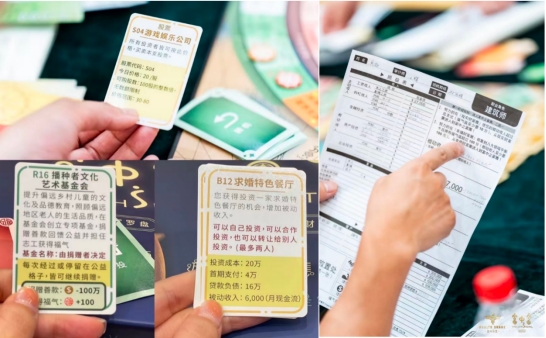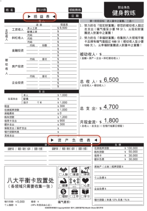 每位玩家首先会抽取“职业角色”,比如抽到的角色是“健身教练”,再抽取卡牌,不断作出投资决策、人生决策。伴随着每一次的决定,可以清晰地“看”见自己财务状况的变化、感受到现金流的方向,了解金钱运动的规律,学习如何编制个人版和家庭版的“资产负债表”、“损益表”和“现金流量表”,表上的财富数字就会随着决定而变动。同时引导人们实践“工作、理财、健康、家庭、心灵、人脉、休闲、学习”这八大领域均衡的“富中之富”平衡人生。