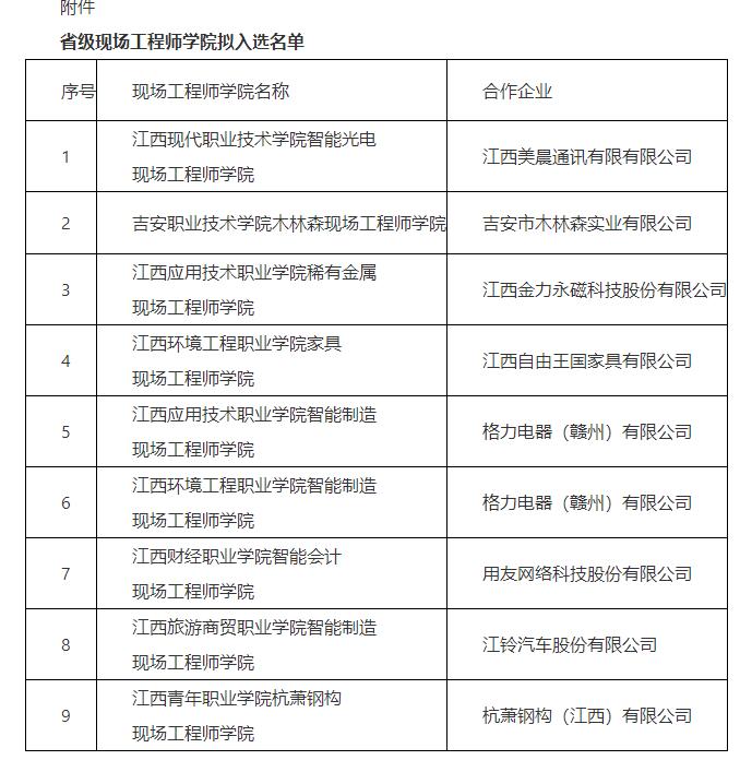 根据省教育厅、省工信厅、省国资委、省发改委《关于开展省级现场工程师公司遴选工作的通知》(赣教职成字〔2024〕17号)要求,经材料初评、业绩公示、实地考察等环节,包括公司“智能会计现场工程师公司”在内的9家现场工程师公司被遴选为首批省级现场工程师公司。